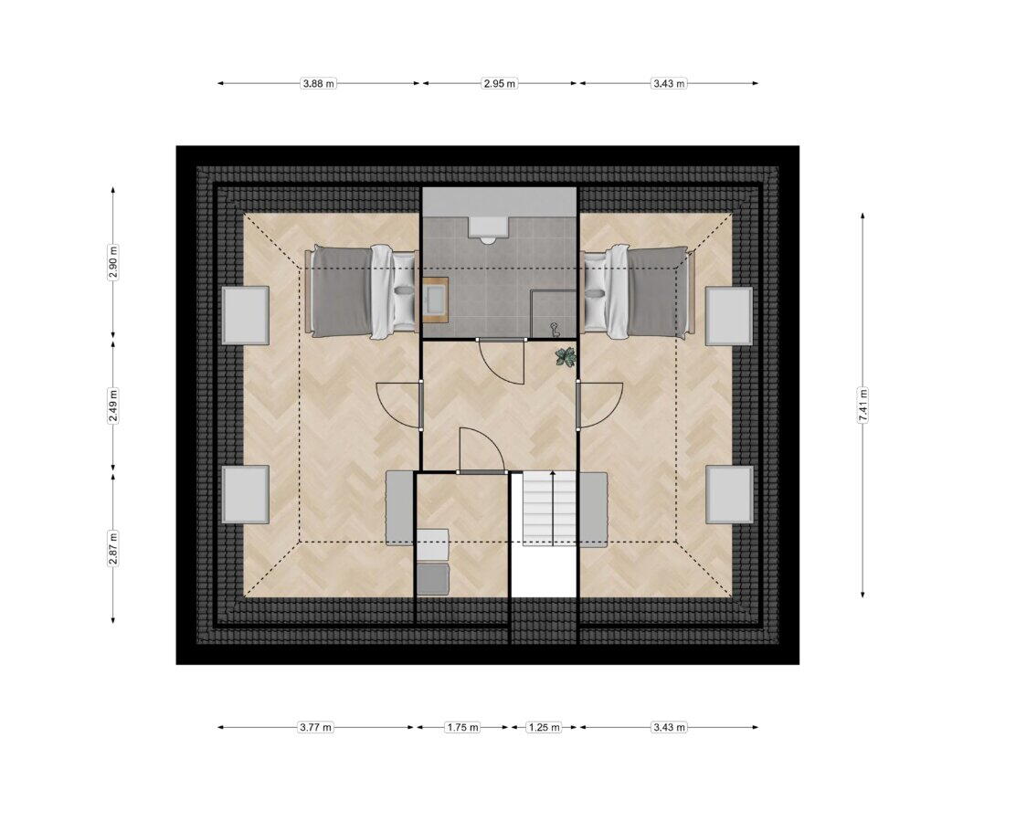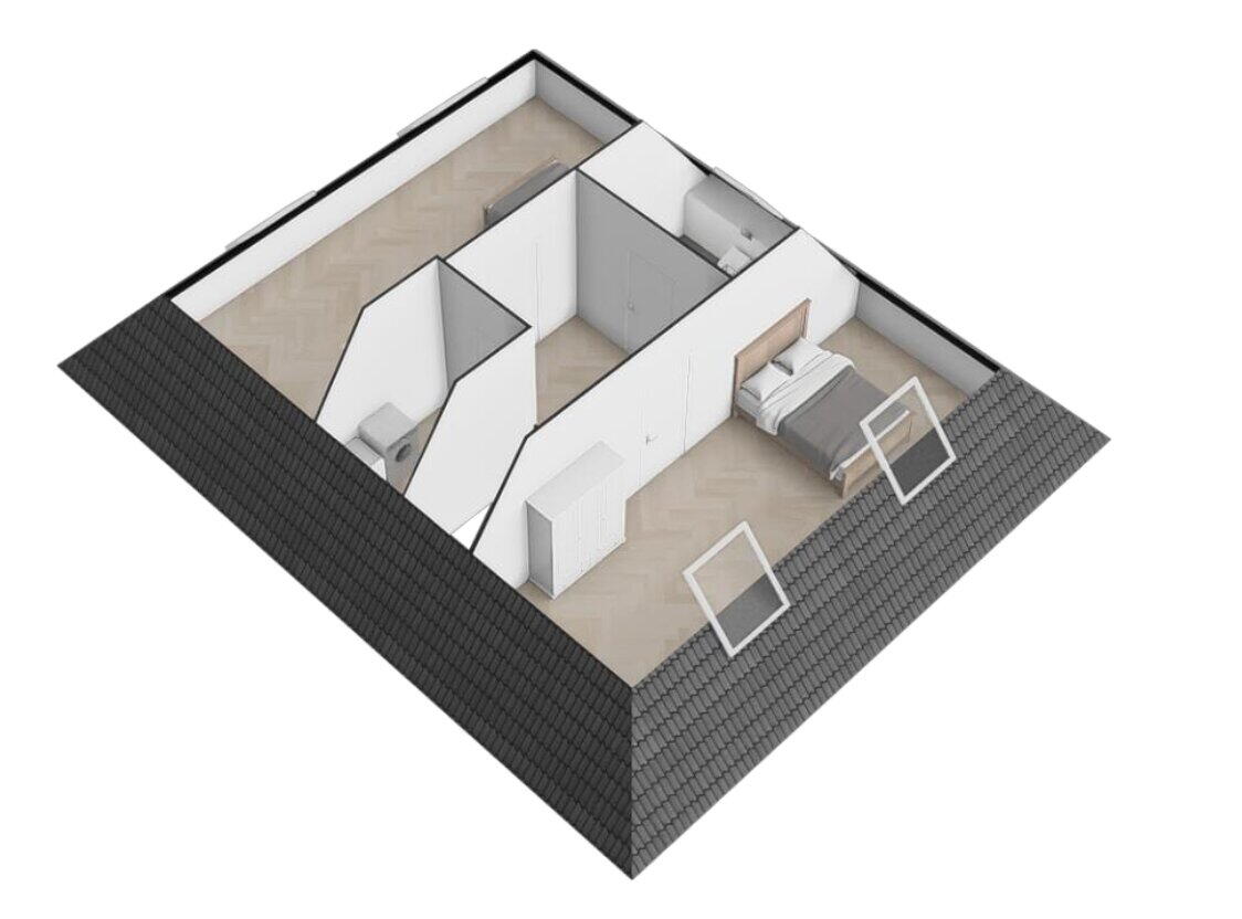 Ruime volwaardige zolderverdieping met twee slaapkamers en een tweede badkamer. Op deze etage zal er een wasruimte gemaakt worden.