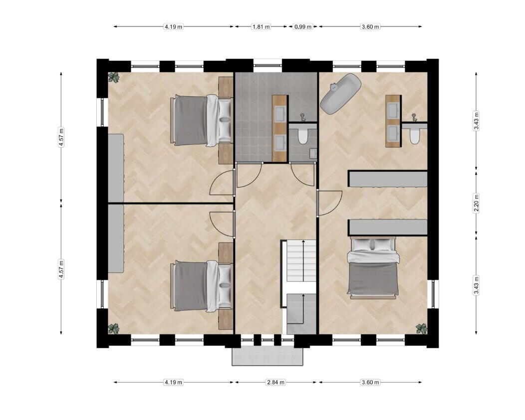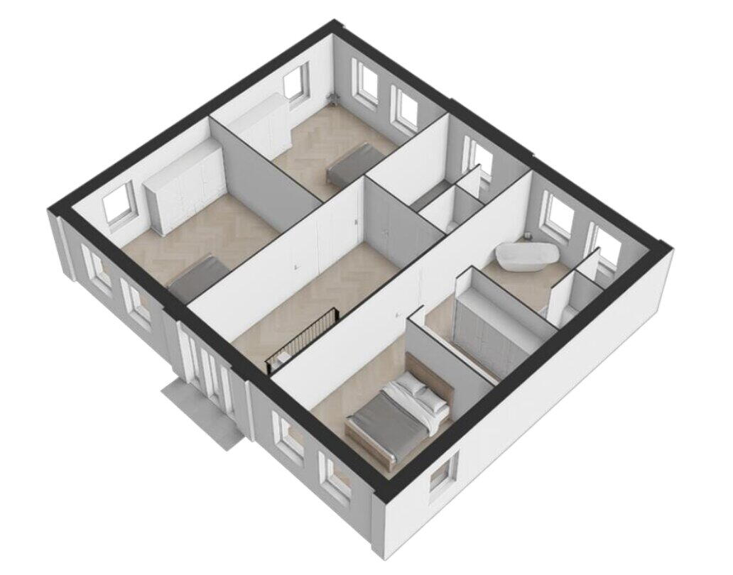 Op deze etage worden drie grote slaapkamers en twee casco badkamers gecreëerd waarvan 1 badkamer en suite bij de grootste slaapkamer.